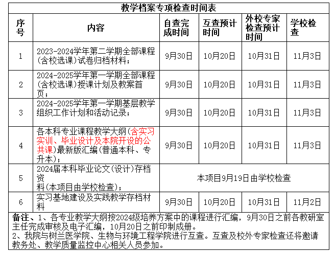 各项自查内容及要求以学校通知为准(http://jwc.zjsru.cn/info/1065/21685.htm ),请各教研室/实验室及全院教师按时完成各项自查任务,确保教学档案完整、规范。