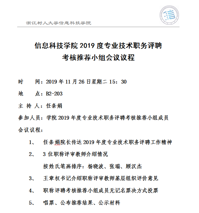 9999js金沙老品牌2019度专业技术职务评聘考核推荐小组会议议程