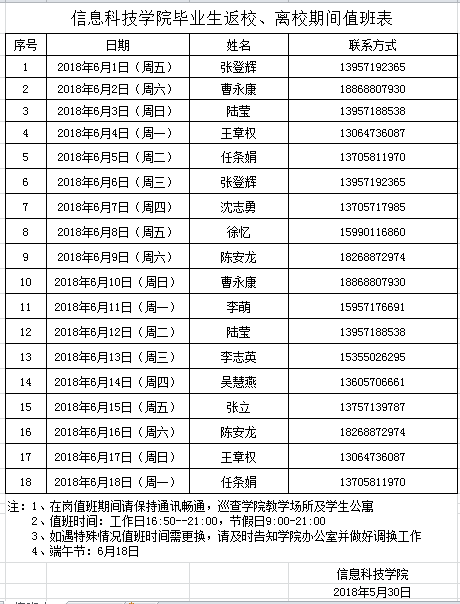 9999js金沙老品牌毕业生返校、离校期间值班表