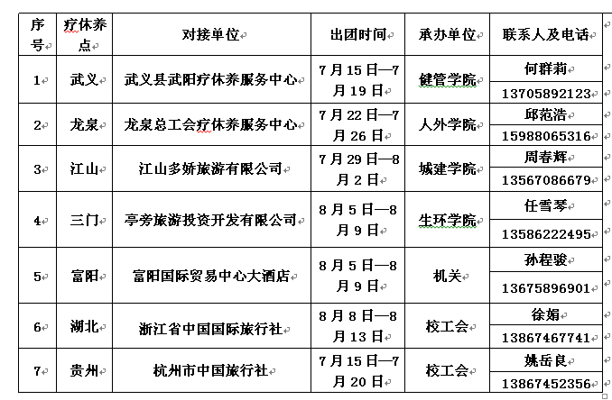 根据省教育工会《关于公布2018年省教师疗休养基地和服务单位的通知》(浙教工【2018】14号)精神,选择7个省内外疗休养地点,其中2个为省外疗休养服务单位。