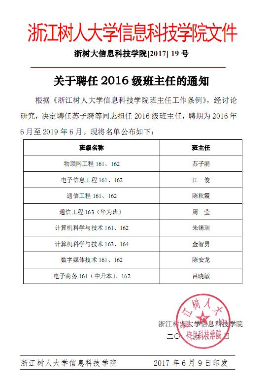 关于聘任2016级班主任的通知