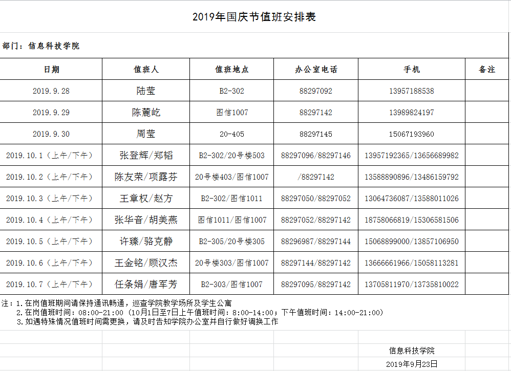 各位老师好,根据校网“关于2019年国庆放假安排的通知”,10月1日至10月7日放假调休,共7天。9月29日(星期日)补10月4日(星期五)的课,10月12日(星期六)补10月7日(星期一)的课。放假期间根据上级要求和学校实际,9月28日至10月7日期间,学院安排人员在岗值班,值班时间为8:00-21:00。按照学院全体教师轮流值班顺序表及学校的要求,学院在岗值班安排表如下,请值班人员务必尽职尽责,严格落实值班岗位责任制,确保广大师生度过一个欢乐、祥和的节日假期。