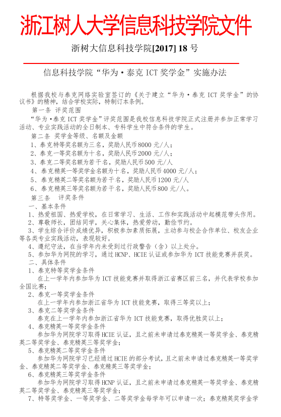 9999js金沙老品牌“华为·泰克ICT奖学金”实施办法