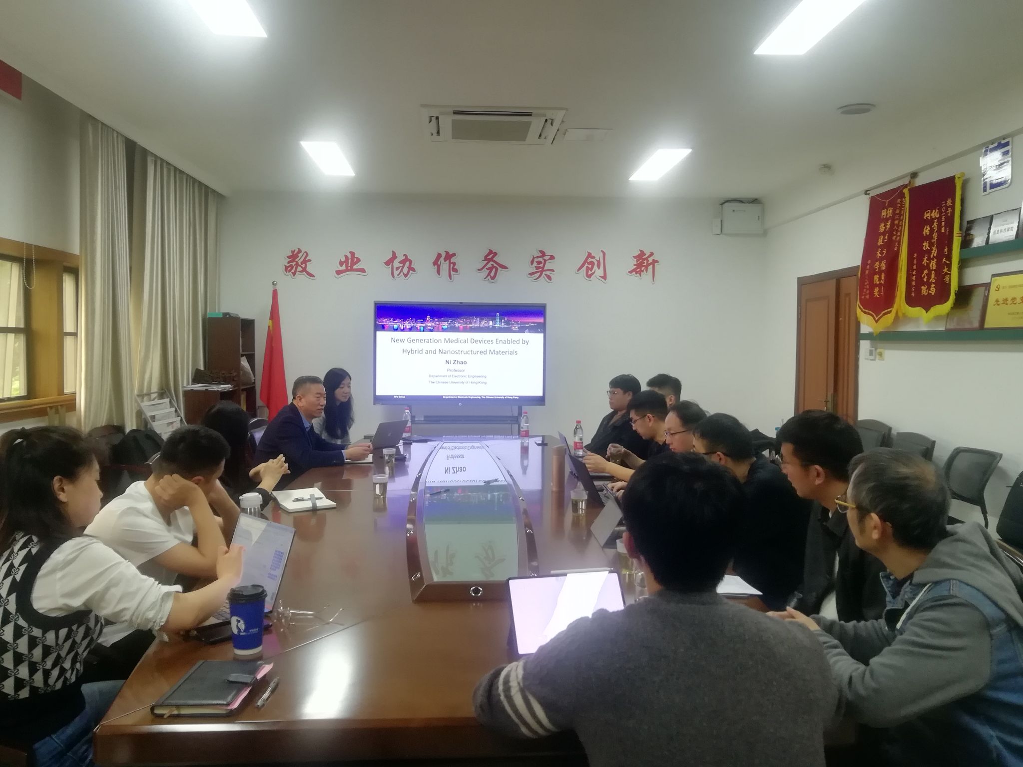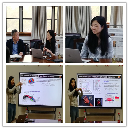 交流会上,赵铌教授以“New Generation Medical Devices Enabled by Hybrid and Nanostructured Materials ”为题,从目前全球对个性化医疗技术、新一代高性能、低成本、高兼容可穿戴传感器的日益增长需求出发,介绍了如何利用低温加工混合技术和纳米结构材料研发新型可穿戴医疗设备,并以设计用于无创生理测量的柔性光学设备为例,详细介绍了用于连续跟踪心率变异性、动脉血压和脑氧合的高灵敏度光学探针的发展及用于高光谱成像的单点光谱仪的设计,给出了一种新的生理参数检测模型,可以普遍应用于可穿戴传感器,实现动脉刚度和血压的动态跟踪。互动环节,热烈深入,赵教授对大家提出的问题作了详细地答复,并结合当前其研究工作与项目申报经验与老师们进行交流与分享。