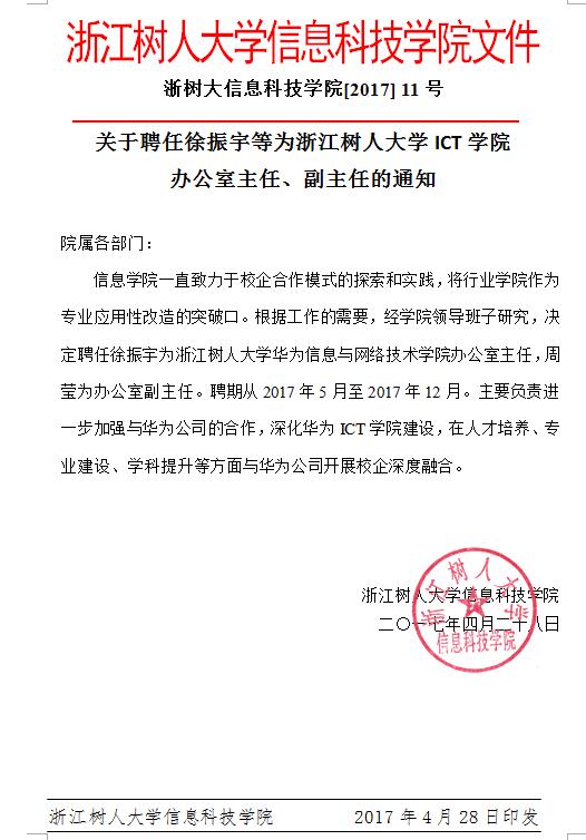 2017年11号 关于聘任徐振宇等为浙江树人大学ICT学院办公室主任、副主任的通知