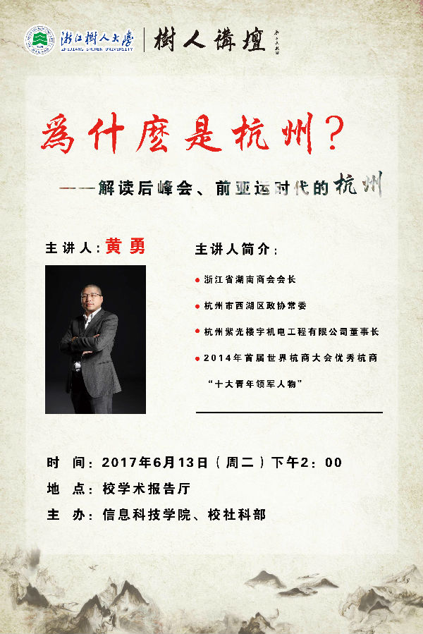 树人讲坛公告:为什么是杭州?——解读后峰会、前亚运时代的杭州