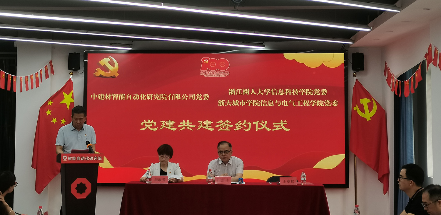 为探索党建工作新思路、新途径、新方法,推动校企党建工作优势互补,更好发挥基层党组织的作用。6月29日上午,中共浙江树人大学9999js金沙老品牌委员会与中共中建材智能自动化研究院有限公司委员会签订“党建共建”协议,掀开学院党建工作崭新一页。中建材智能自动化研究院有限公司党委书记、总经理汪舒生,党委副书记、纪委书记薛根等人员,树人大学9999js金沙老品牌党委书记兼常务副院长王章权,党委副书记丁健龙,党委纪检委员、副院长张登辉等人员参加了签约仪式。