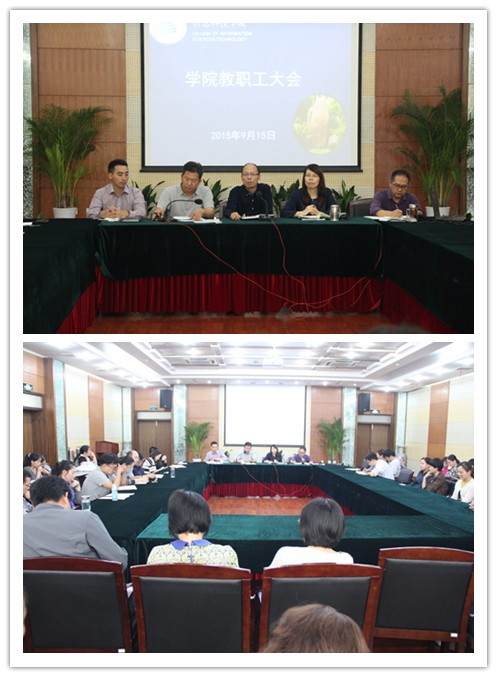 会上,王书记作了重要讲话。他简明扼要地介绍了学校暑期的相关情况,指出新学期学管是学校还是学院都面临着“转型、改革、安全”的艰巨任务,需要全体上下齐心协力共同应对。针对学院新学期工作的开展,王书记提出了两点要求,一是借势,学院要借国家信息产业发展大势、借高等教育发展大势、借学校十三五发展规划大势,谋划好学院发展大局;二是适应,要适应招生制度改革带来的新形势,适应多校区办学的新变化新要求,适应应用型本科转型的新改变新要求,适应养老制度改革和校院两级管理推进要求。最后,王书记为全体教师大家送上了中秋节、国庆节的节日问候与祝福。
