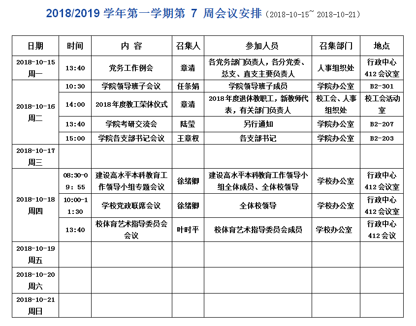 2018/2019学年第一学期第 7 周会议安排