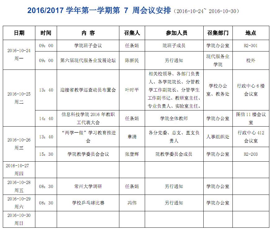 2016/2017学年第一学期第7周会议安排