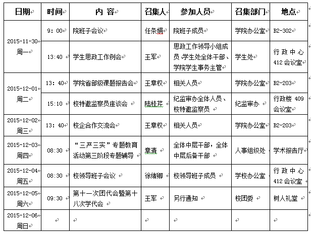 2015/2016学年第一学期第13周会议活动安排
