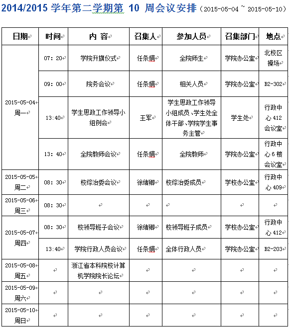 2014/2015学年第二学期第10周会议安排