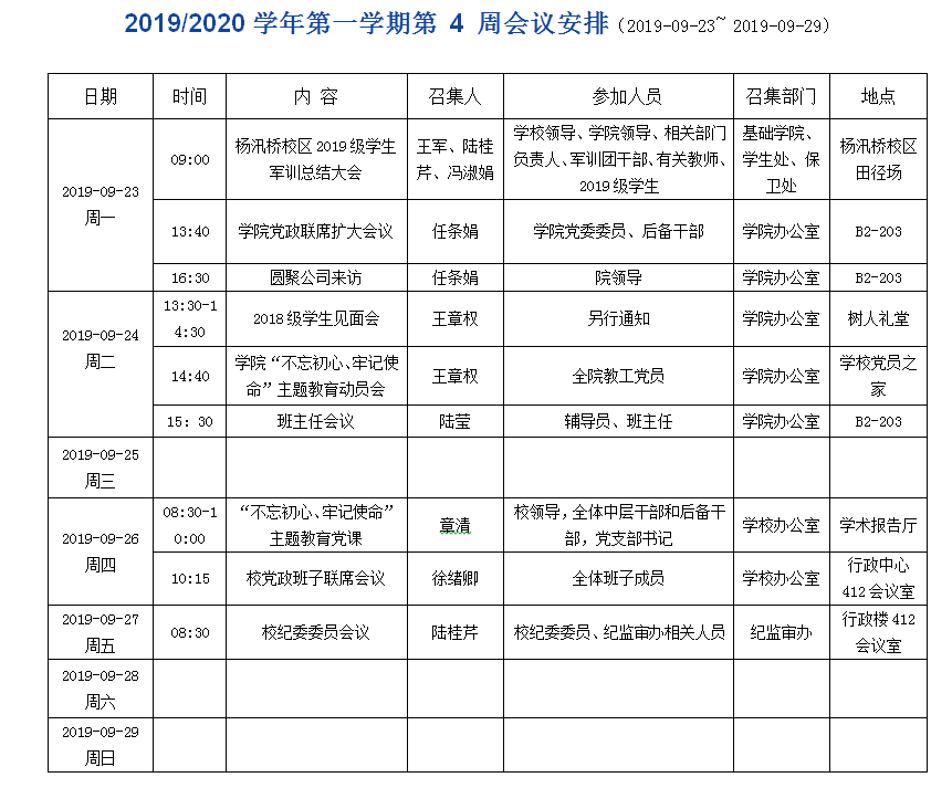 2019/2020学年第一学期第 4 周会议安排