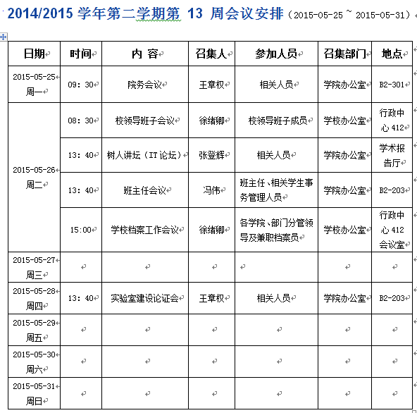 2015/2016学年第二学期第13周会议安排