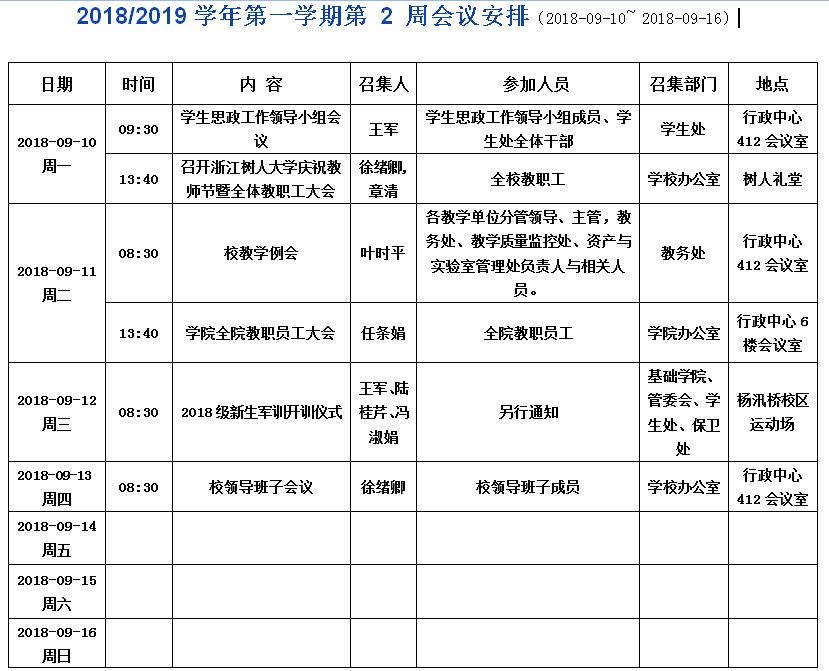 2018/2019学年第一学期第 2 周会议安排