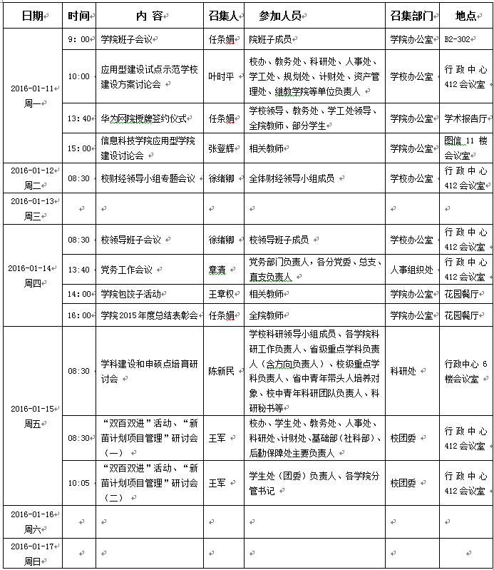 2015/2016学年第一学期第19周会议活动安排