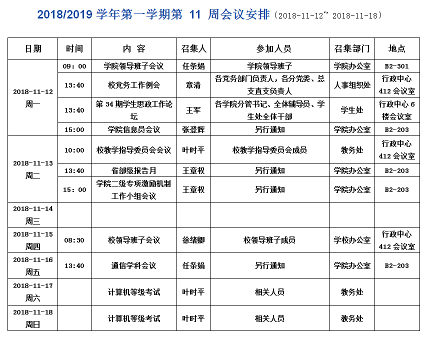 2018/2019学年第一学期第11周会议安排