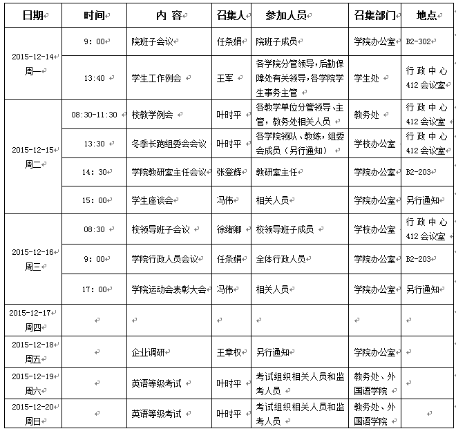 2015/2016学年第一学期第15周会议活动安排