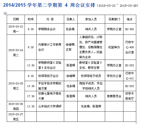 2014/2015学年第二学期第4周会议安排
