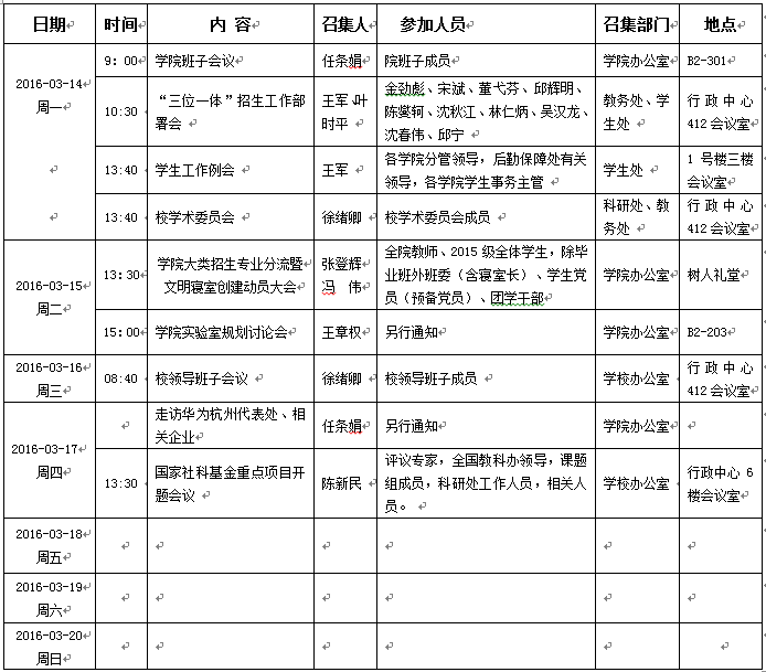 2015/2016学年第二学期第4周会议活动安排
