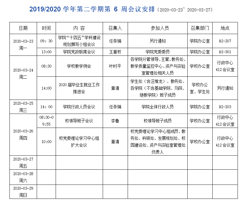 2019/2020学年第二学期第 6 周会议安排