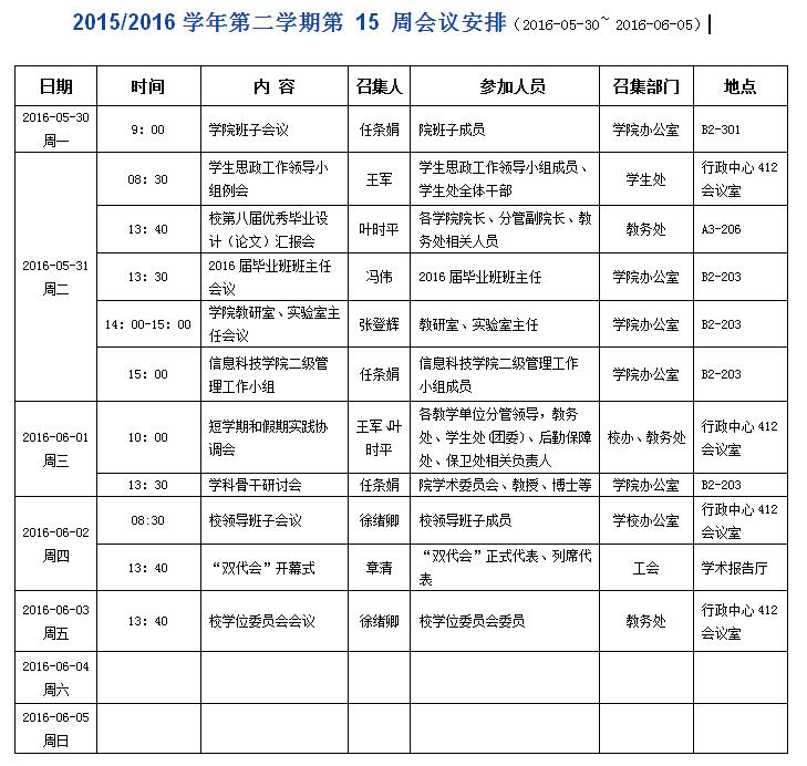 20152016学年第二学期第15周会议安排
