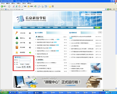 课程中心将本学院各专业的课程集中在一起,为每门课程提供一个专门的管理与共享平台,您可以设置您的课程信息,同时也可以将各类教学材料及共享资源发布到该平台;同时也可发布各类通知、上传各类课件。从而让您的学生能及时获得您所负责课程的各类信息。同时也可以作为您教学改革及课程建设的“教学平台”。希望各位老师能好好地利用该平台。