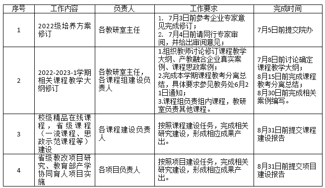 根据学校教务处的工作安排和学院教学建设计划,请全院各教研室、各课程建设小组在近期以及暑期完成以下工作: