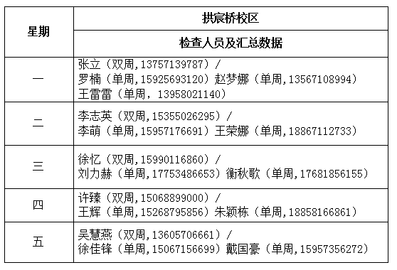 (1) 学院办公室人员负责第1节、第3节课的巡查(课表见附件2),重点检查到课率、课堂秩序、课堂互动与教师规范教学等情况,并于检查当天下午16点前将检查记录表(见附件3)电子稿发给罗楠。具体安排如下: