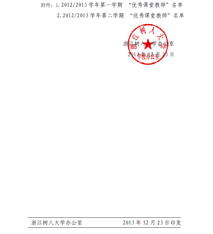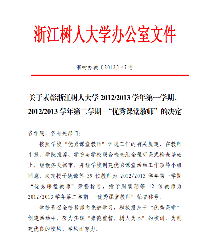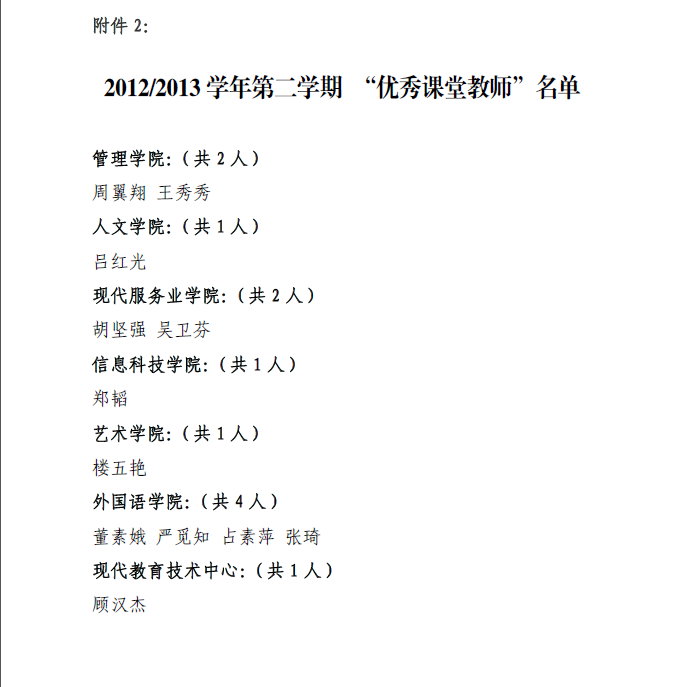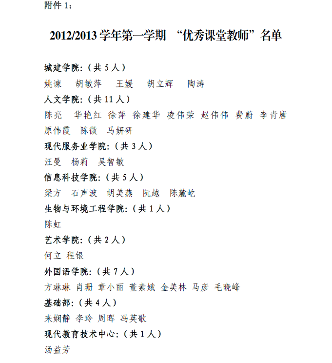 浙江树人大学2012/2013学年第一学期、2012/2013学年第二学期 “优秀课堂教师”名单