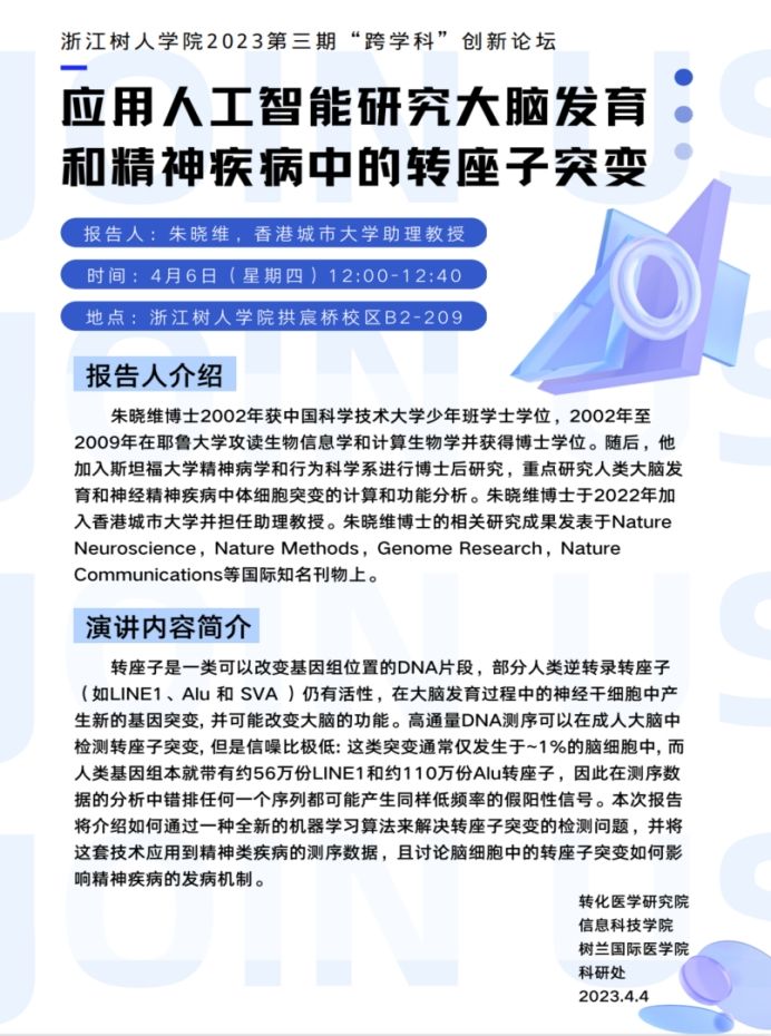 4月6日(星期四)12:00-12:40,学院与转化医学院在B2-209联合举办“应用人工智能研究大脑发育和精神疾病中的转座子突变”跨学科创新论坛,请4月6日上午345节没有课的博士参加,不能参加的请说明原因。也欢迎其他老师参加。