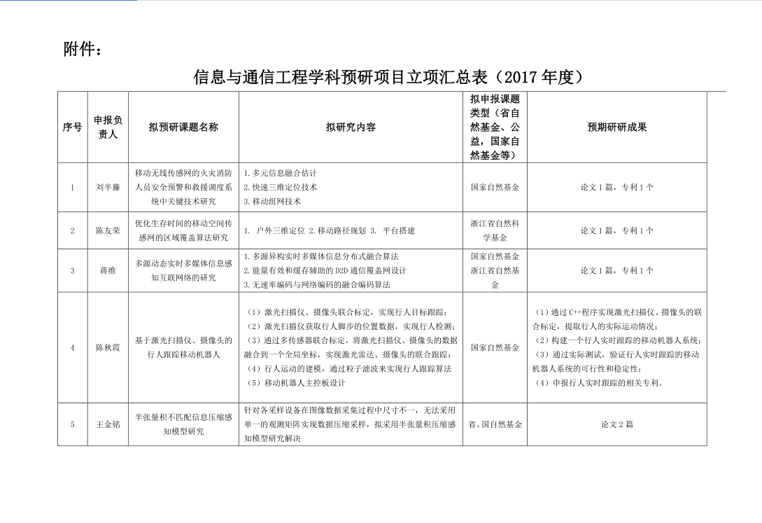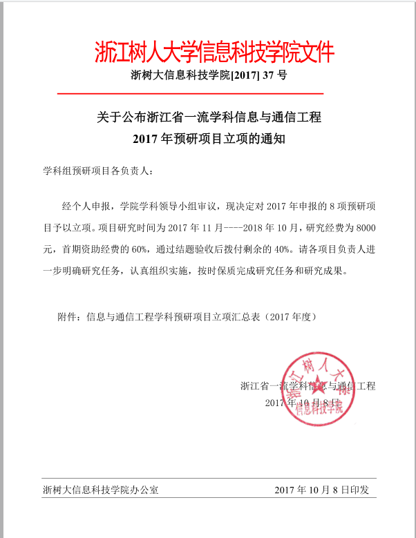 关于公布浙江省一流学科信息与通信工程2017年预研项目立项的通知