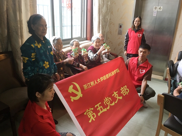 信息学院第五党支部组织党员不忘发挥先锋带头作用,将包好的粽子煮熟并包装好送给了学校的老师和同学们,并送上节日的祝福。另外他们还走出校园,来到敬老院,在端午佳节也为老人们送去一份爱心,带去慰问。