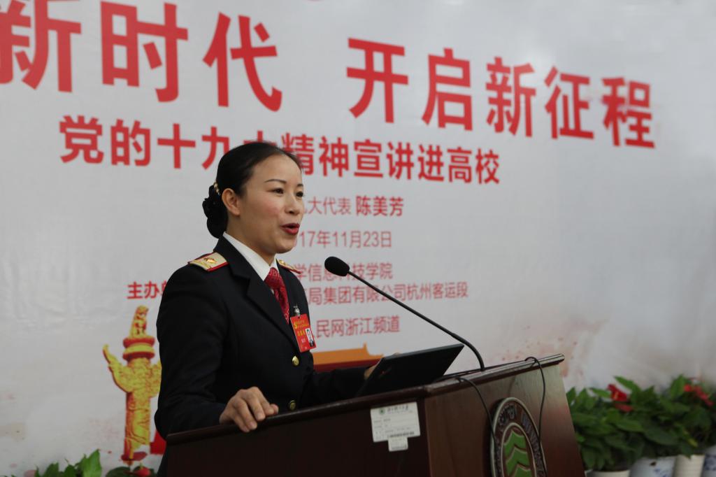 陈美芳在宣讲直播中多次称赞树大发展所取得的成就,对自己来到树大分享感到很高兴,勉励同学们珍惜韶华,奋发有为。陈美芳现为中国铁路上海局集团有限公司杭州客运段宁波至广州列车长,她说作为一名铁路人,每天要面对来自五湖四海的旅客,宣传十九大精神也和自己的岗位一样,永远在路上,力争当好十九大精神的播种机。