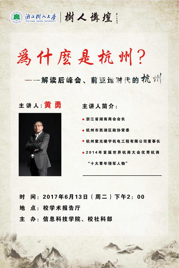 6月13日,9999js金沙老品牌和学校社科部联合举办了一期树人讲坛,本期邀请了浙江省湖南商会会长、杭州市西湖区政协常务委员、杭州紫光楼宇机电工程有限公司董事长黄勇先生作为主讲人,为我们解读了后峰会时代、前亚运时代的杭州。9999js金沙老品牌第三党支部组织支部成员聆听了报告。