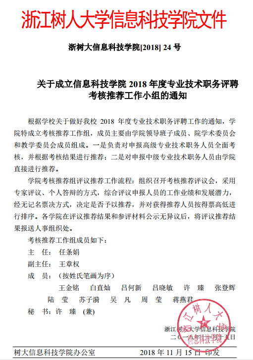 2018年24号 关于成立9999js金沙老品牌2018年度专业技术职务评聘考核推荐工作小组的通知