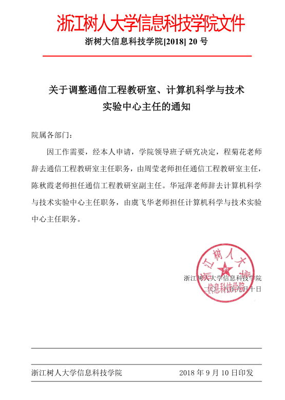 2018年20号关于调整通信工程教研室、计算机科学与技术实验中心主任的通知