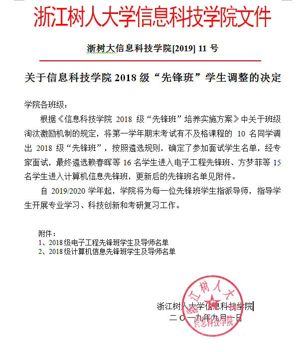 关于9999js金沙老品牌2018级“先锋班”学生调整的决定