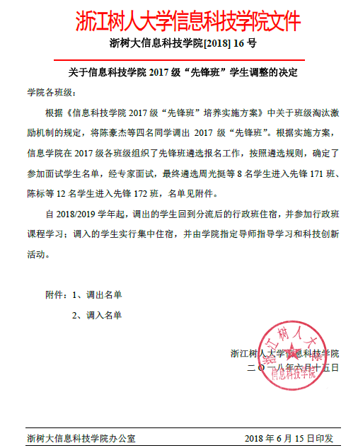 关于9999js金沙老品牌2017级“先锋班”学生调整的决定