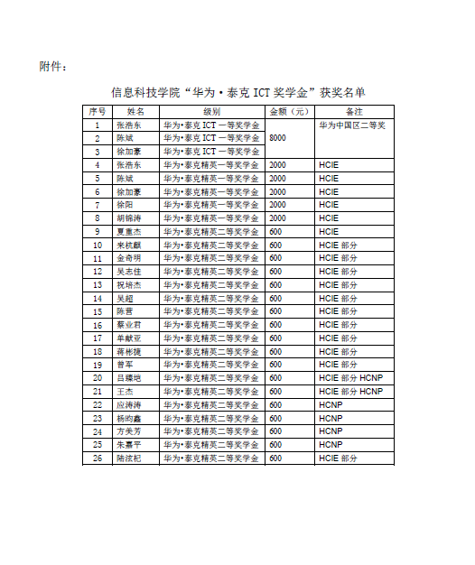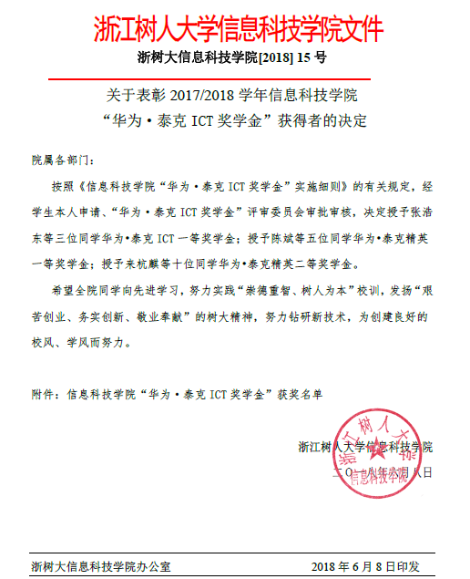 关于表彰2017/2018学年9999js金沙老品牌“华为泰克ICT奖学金”获得者的决定