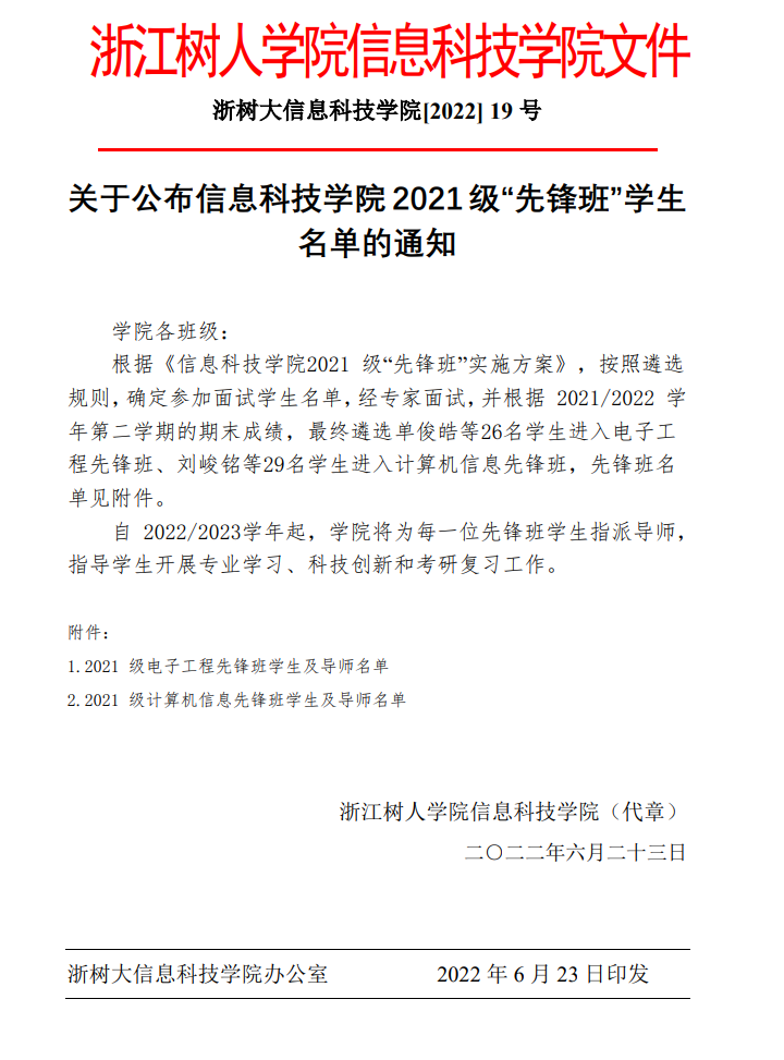 2022年19号 关于公布9999js金沙老品牌2021级“先锋班”学生名单的通知