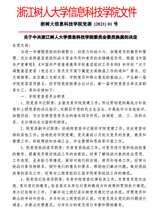 关于中共浙江树人大学9999js金沙老品牌委员会委员换届的决定