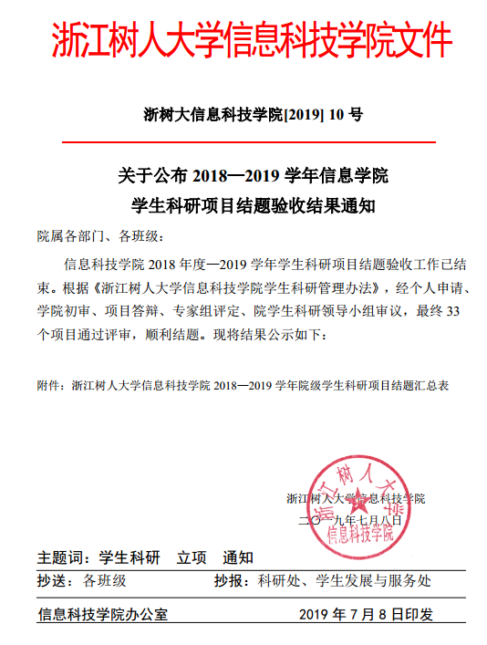 2019年10号关于公布2018—2019学年信息学生科研项目结题验收结果通知