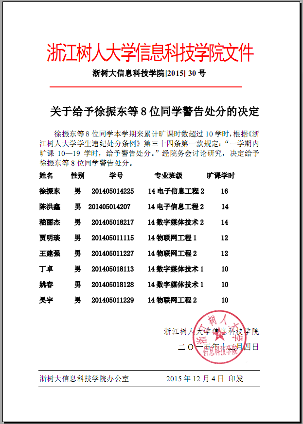2015年30号 关于给予徐振东等8位同学警告处分的决定