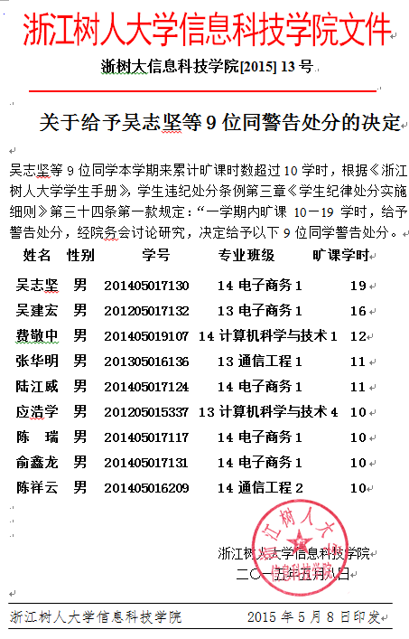 2015年13号 关于给予吴志坚等9位同学警告处分的决定