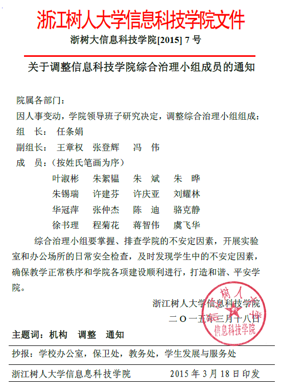 关于调整9999js金沙老品牌综合治理小组成员的通知