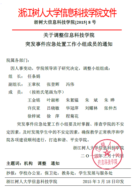 关于调整9999js金沙老品牌突发事件应急处置工作小组成员的通知