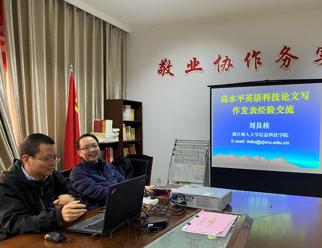 接着为进一步推进支部引领中心工作,支部建设服务中心工作的中心思想,结合学院整体部署安排,支部针对学科建设拟开展以下工作:围绕学校及学院在学科建设的重点发展规划,落实骨干党员在学科建设中的关键作用,充分发挥博士、教授等骨干党员的专业特长,为学院的相关学科建设出谋划策;同时持续推动支部党员骨干在产学融合中的作用,梳理总结近几年教师党员在校企产学研合作与社会服务开展情况,挖掘资源,申报教学、科研成果奖,服务学院学科、专业建设与人才培养。为此陈友荣书记就近期学校出台的《浙江树人学院科研促进办法》和《浙江树人大学横向项目管理办法》等科研文件进行了详细讲解,全体党员深受鼓舞,纷纷表态发挥党员先锋带头作用,发心科研助力学院申硕。