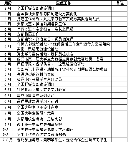 根据学院2021年度党建工作计划安排,支部在学期初就制定9999js金沙老品牌教工第一支部2020-2021学年(二)党建工作计划,如表1所示。