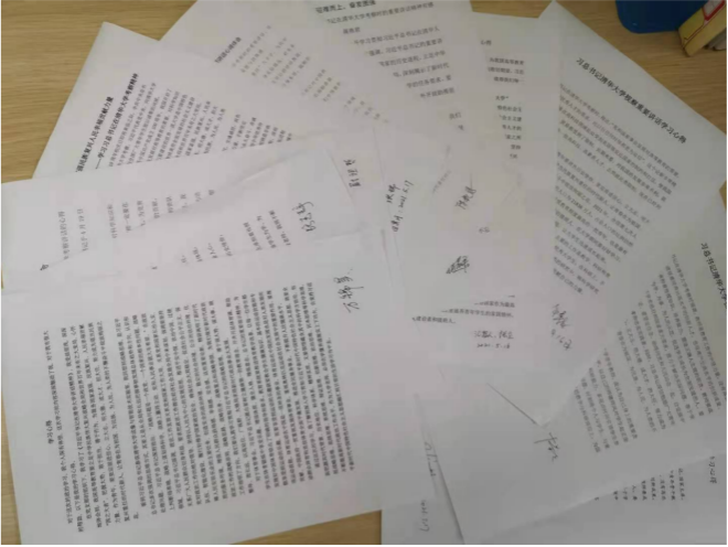 根据学校党委以及学院党委的指示,组织支部教工党员集中学习了习近平总书记的一系列讲话:(1)习近平总书记在清华大学建校110周年时的重要讲话精神;(2)习近平总书记科学的思维方法在浙江的探索与实践;(3)《习近平总书记在浙江》主题学习;(4)习主席致厦门大学建校100周年的贺信精神;(5)习近平总书记庆祝建党100周年讲话精神。支部教工党员每人书写的学习心得并签名上交。